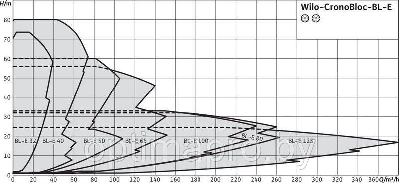 Wilo-CronoBloc-BL-E – серия моноблочных насосных агрегатов с сухим ротором. Все модели этой серии оснащены электронно-регулируемым приводом. Основные рабочие части выполнены из чугуна марок EN-GJL-250 илиEN-GJL-200. Под заказ возможна поставка агрегатов с бронзовым рабочим колесом и в корпусе из чугуна с графитовыми микровключениями EN-GJS-400-18-LT.